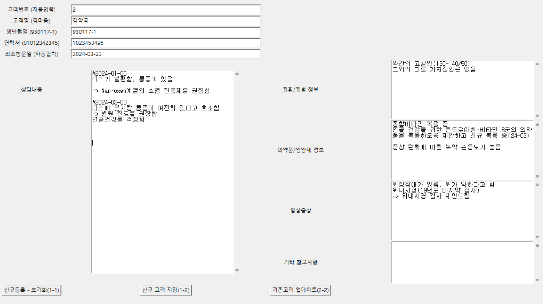 이렇게 중요한 건강관리 업무를 대부분의 약사님들은 단골 손님들을 기억하거나, 조제프로그램을 이용하는 경우가 많습니다. 별도의 엑셀 파일을 이용하여 약력관리를 하기도 하지만 사용하기 번거로운 경우가 많습니다. 아래 소개할 프로그램은 엑셀(csv) 파일의 데이터를 기반으로 아래 사진과 같이 고객의 약력관리를 할 수 있습니다.