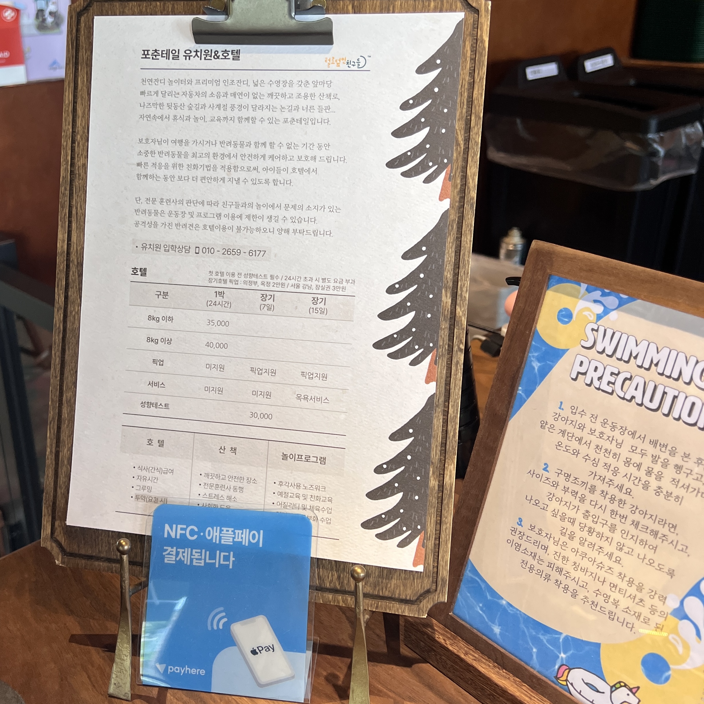 카운터에는 호텔/유치원에 대한 안내문이 적혀있었고, 수영장 이용 관련 유의사항이 적혀있었다. 또한 애플페이 지원된다.