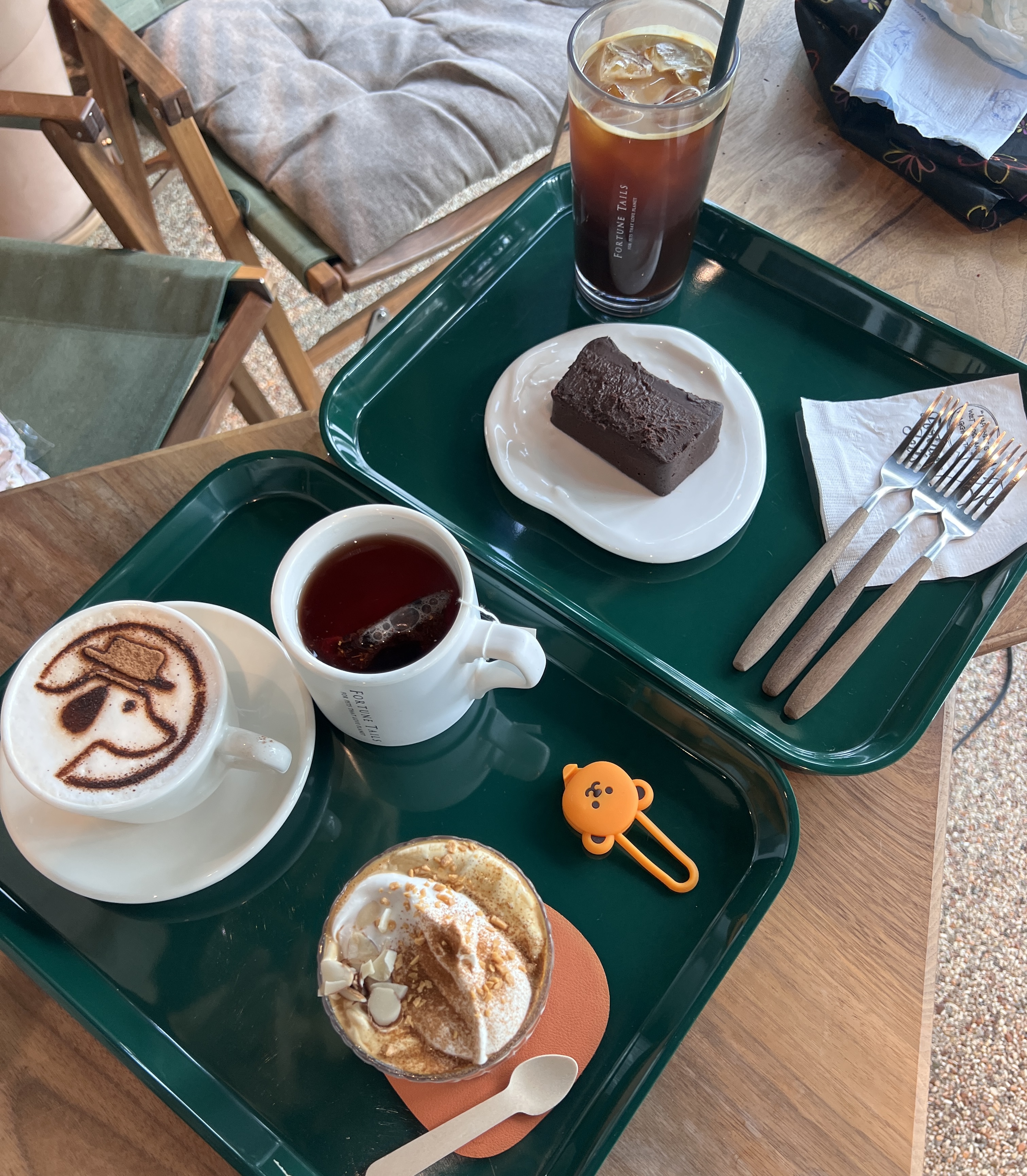 음료로 아이스아메리카노, 블루베리 히비스커스 티, 포춘테일 넛라테를 시켰고 퍼푸치노도 한잔 시켰다.