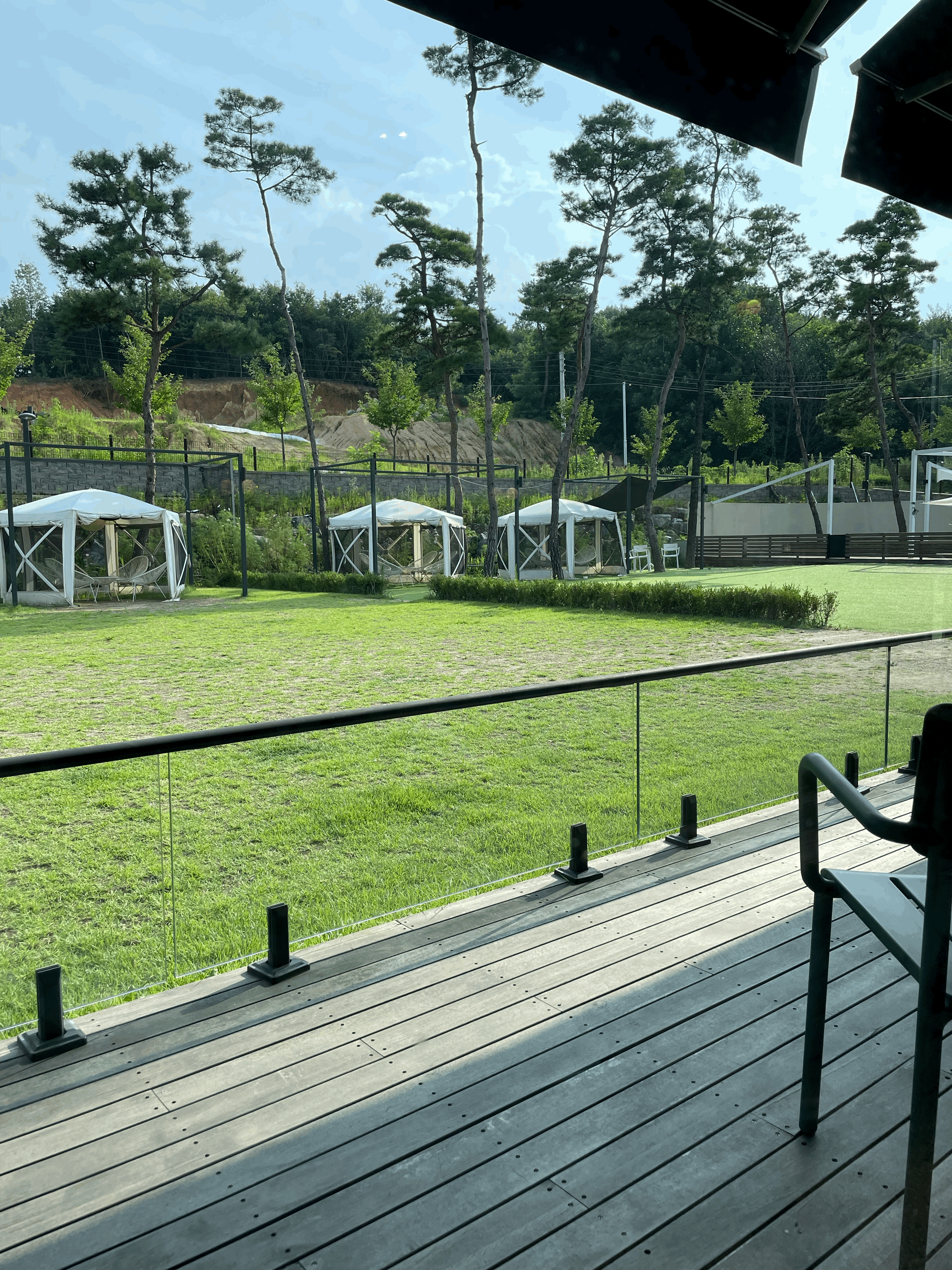 밖에는 넓게 천연잔디가 펼쳐져 있었고, 반대쪽 공간에는 수영장과 함께 인조잔디가 있었다. (수영장 이용 무료)