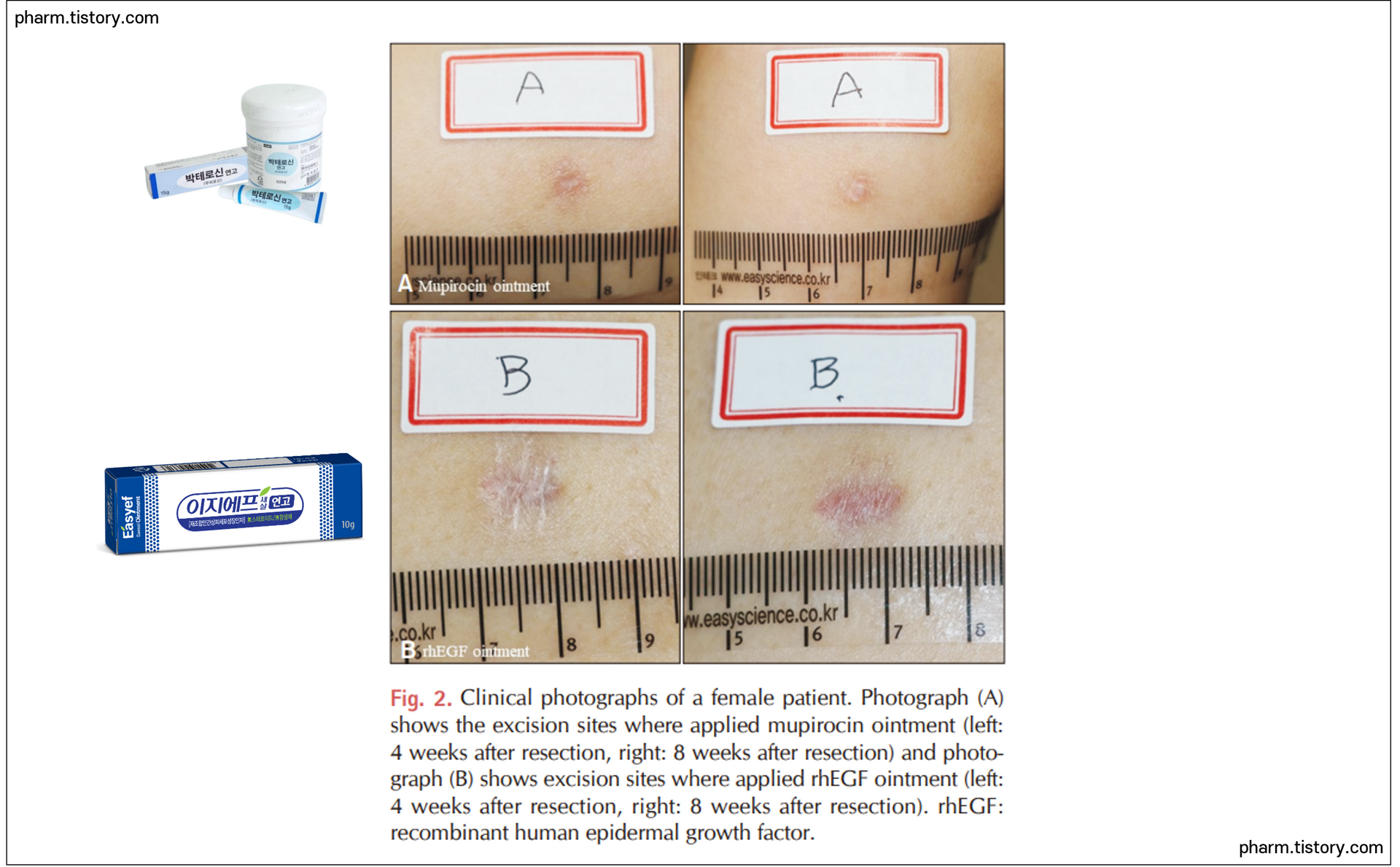 피부재생을 돕고 켈로이드/비후성상처에 도움이 됩니다. rhEGF는 그 자체로 세포 재생을 촉진시키는 성분이기 때문에 아래 사진과 같이 경증 흉터와 붉은 발적에 대해 Mupirocin 항생제를 통한 피부 변화(A)와 경증의 켈로이드성 상처가 EGF 새살연고 사용 시 완화(B)되는 것을 확인할 수 있습니다.