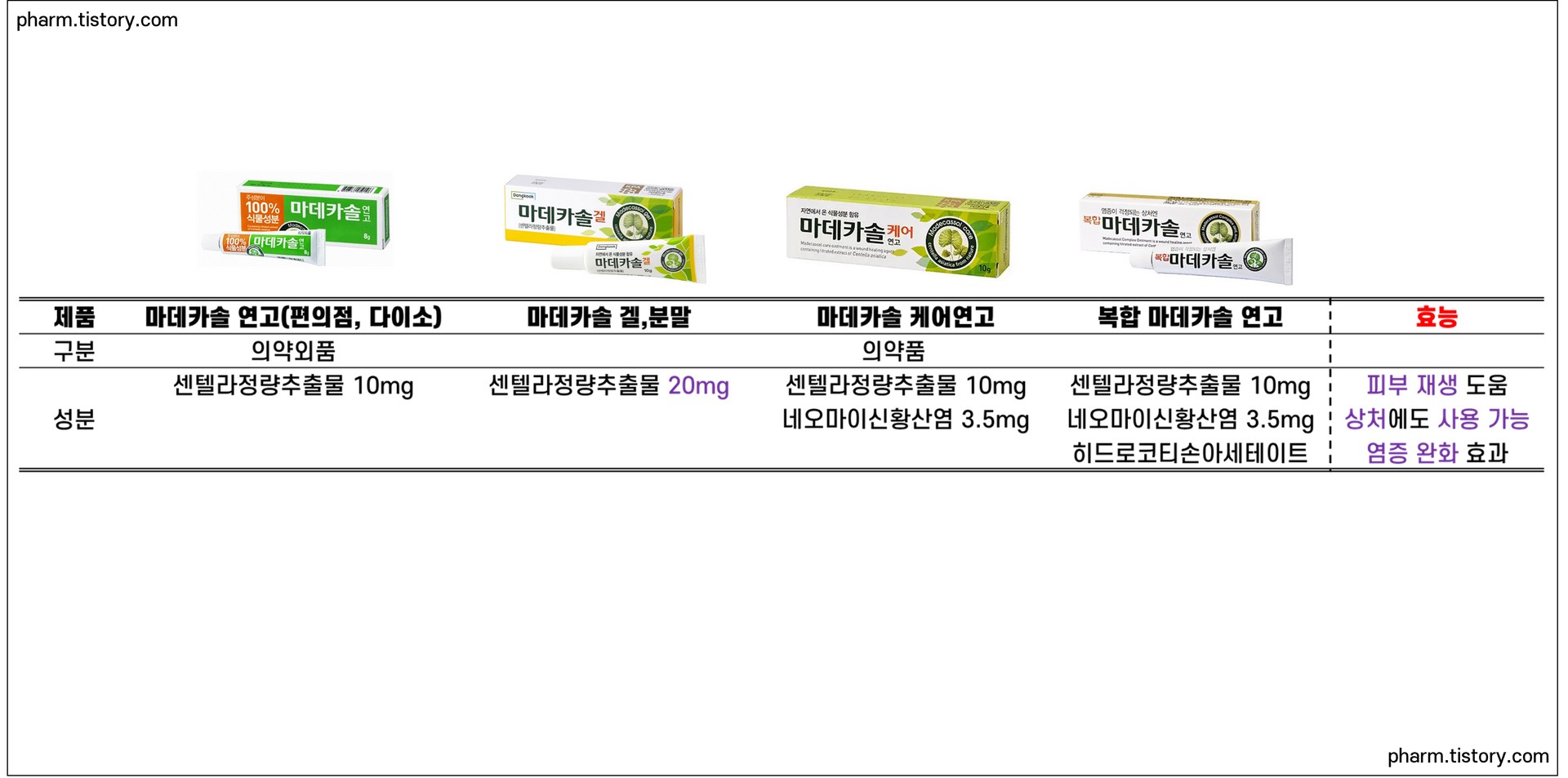 아래는 "마데카솔"로 잘 알려진 의약외품 및 의약품의 성분 비교입니다.