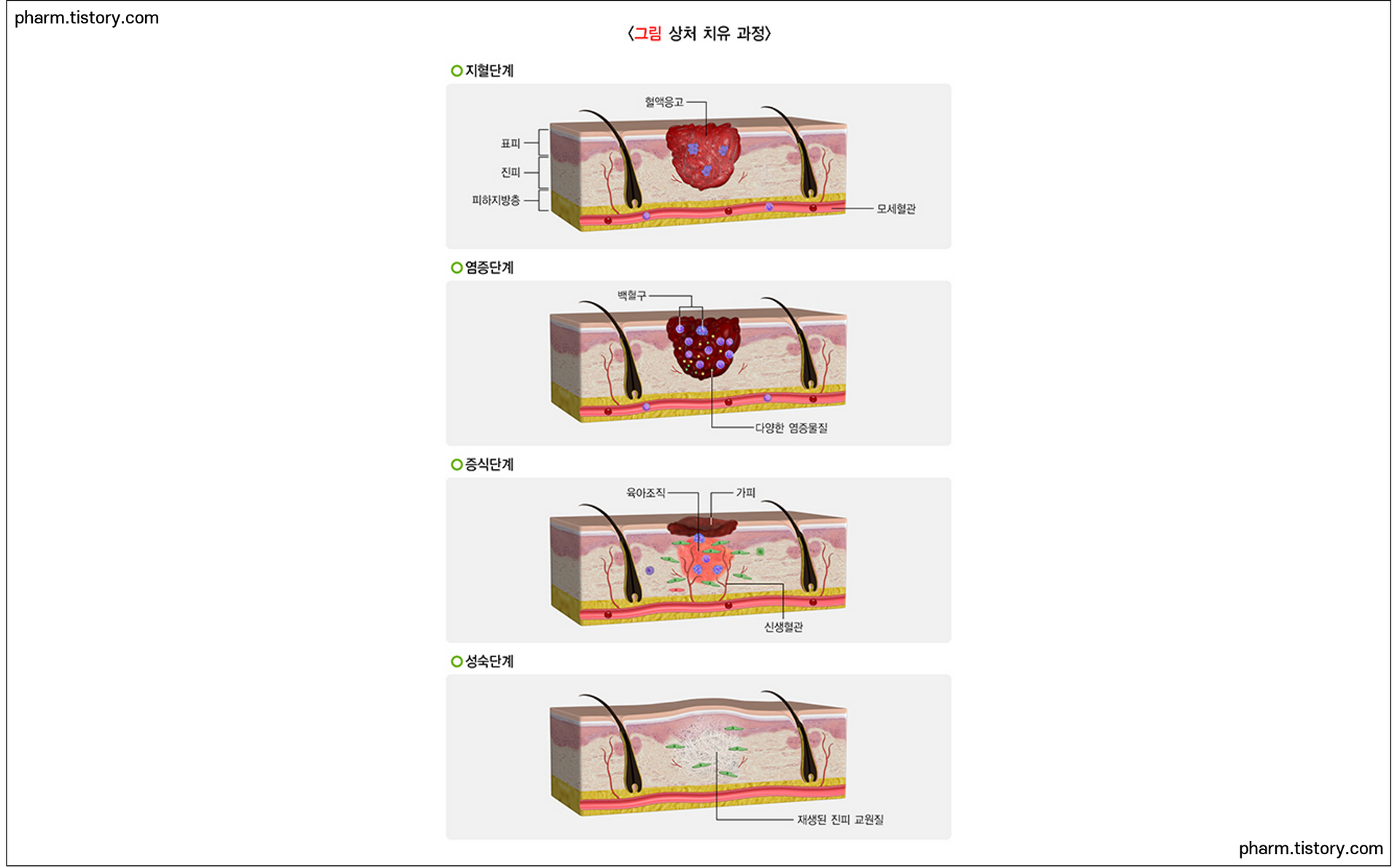 피부상처는 크게 4가지의 단계로 회복이 일어납니다. 초기 지혈, 염증단계에서는 항생제 연고를 통해 균감염을 억제하여 염증과 농 발생을 최소화시켜야 합니다.