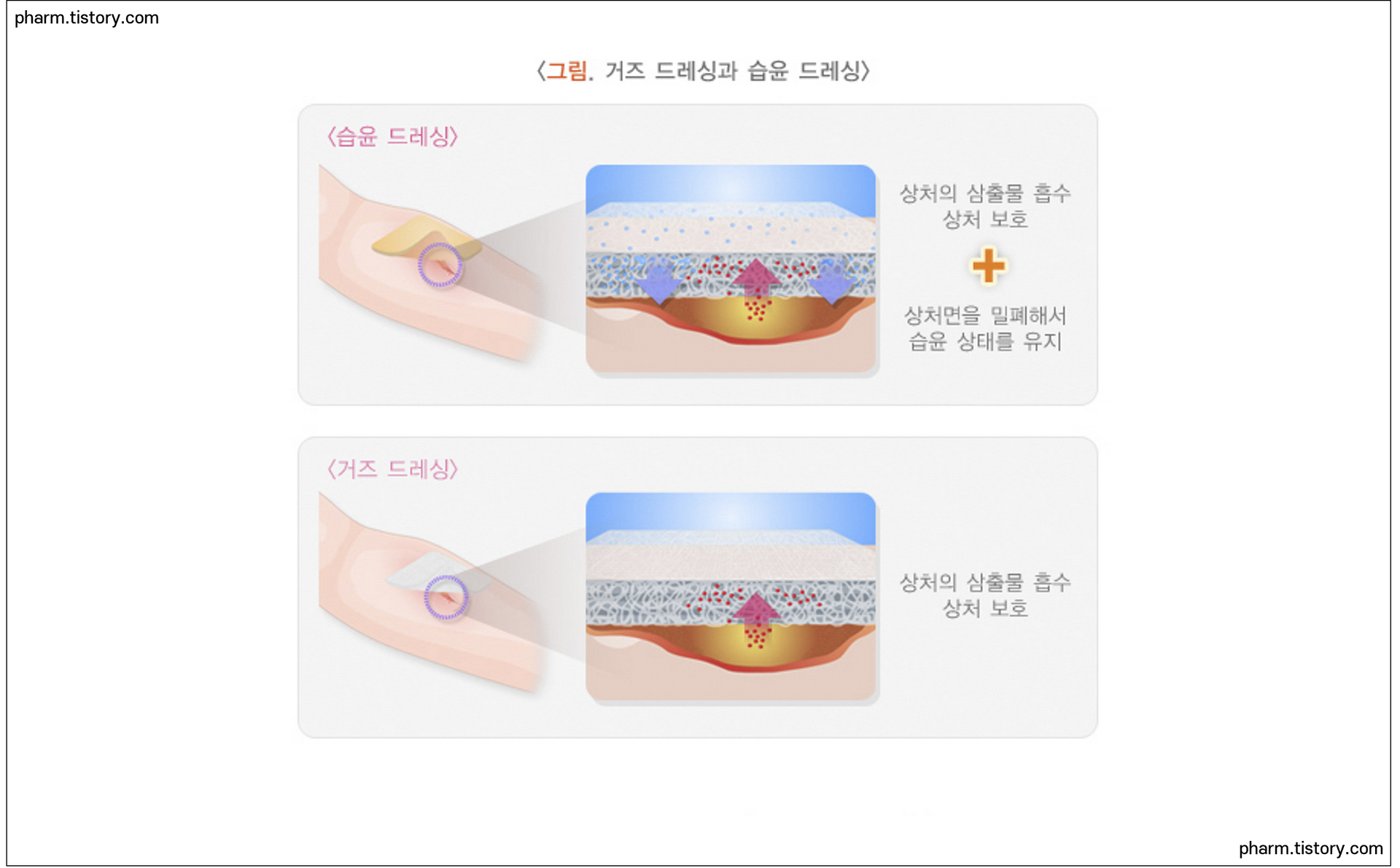 - 환부의 크기와 출혈, 삼출물 양에 따라 습윤밴드/드레싱이 도움이 될 수 있습니다.