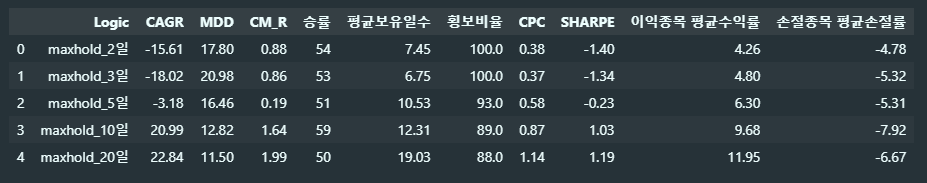 매도 로직을 설정하지 않았다면, 최대 보유일수에 따라 CAGR과 MDD가 일반적으로 크게 변동한다. 로직에 비해 평균 보유 일수가 짧으면 충분한 수익을 내지 못해 MDD를 안정적으로 지켜 내더라도 CAGR이 더 낮아 유효한 손익비를 가진 전략을 운용하기 힘들다.