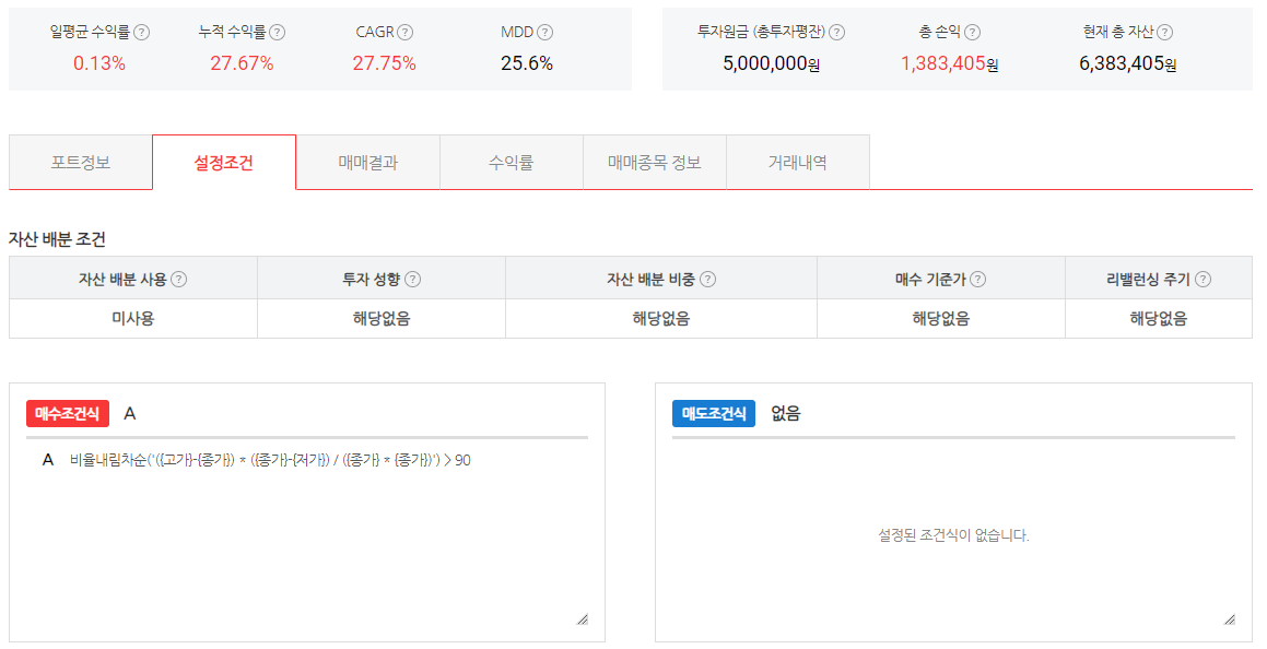 매수 조건식 : 비율내림차순('({고가}-{종가}) * ({종가}-{저가}) / ({종가} * {종가})') > 90