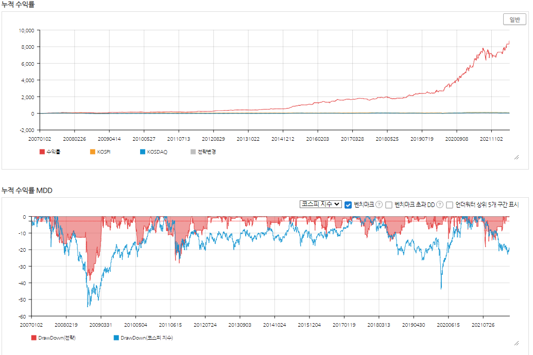 PBR이 1보다 낮은 주식 중 지수 마켓타이밍 조건을 넣어 거래한다면, 2008년도 금융위기를 제외한 거의 전 지점에서 낮은 MDD로 안정적인 자산 증식이 가능하다.