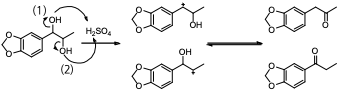 ㄱ. 산 조건에서 다음과 같이 반응하면 작용기에 따라 (1)번 반응과 (2)번 반응이 진행할 가능성이 있다. 이 반응은 SN1반응이므로, 탄소양이온 중간체가 형성되는 과정이 속도 결정단계이다. 따라서 (1)번 반응의 경우, 2차 Benzyl Carbocation이고 (2)번 반응의 경우, 2차 Carbocation으로 (1)번 반응이 주 반응이다. 또한, 반응물은 산 조건에서 Acetal 평형관계에 놓여있는데 반응이 진행되고 Acetal 평형반응도 진행하기 때문에 Catechol화합물이 생성될 가능성도 존재한다. 어느 관점에서든지 주 생성물은 제시된 생성물이 될 수 없다.