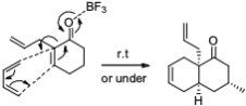 A반응은 루이스 산 촉매인 BF존재 하에서 Diels-Alder 반응이다. 루이스 산과 같은 촉매를 이용하면 0도 이하에서도 Diels-Alder반응을 일어나게 할 수 있는데 이는 endo-product가 생기는 조건과 같아 Cis-Decaline 유도체가 형성됨을 알 수 있다.