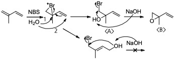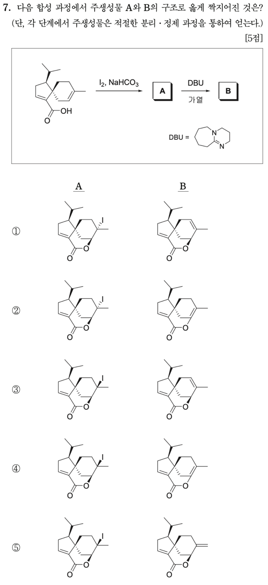 또한 반응물은 <3>번과 같은 입체화학을 띄고 있으므로 <2>번과 같은 중간체가 생성된 후 NaHCO3-의 염기로 인해 Carboxylic acid가 친핵성 고리열림반응이 진행되어 <4>번과 같은 화합물이 생성된다. B가 생성되는 반응의 경우, <4>번 화합물에서 Hoffmann Elimination이 일어나 보다 덜 치환된 생성물이 주 생성물로 된다. Hoffmann Elimination의 경우 tBuO, DBN, DBU, Ag2O와 같은 시약을 이용하기도 한다.