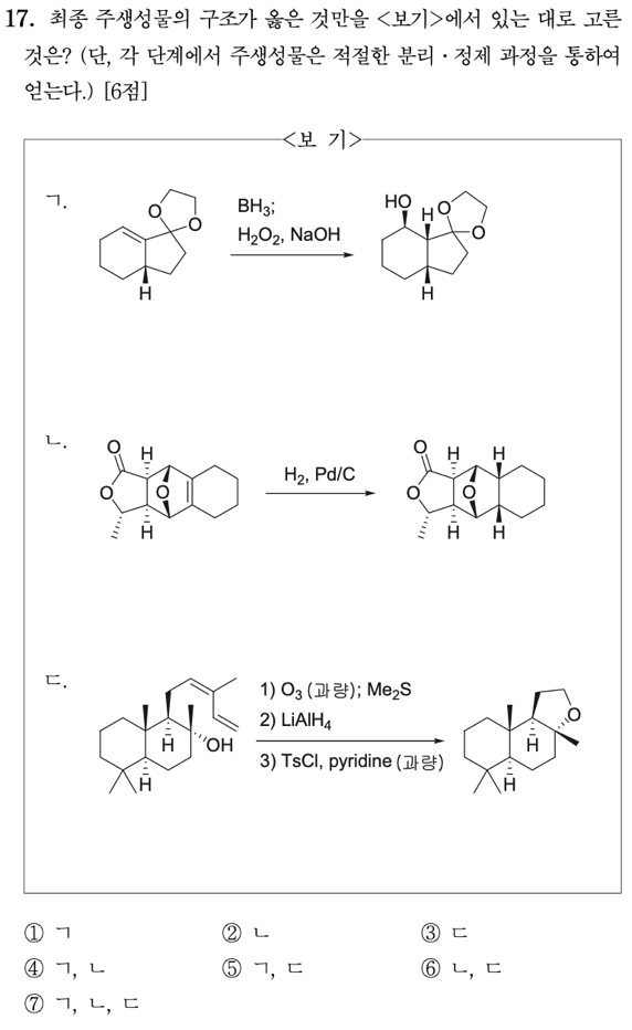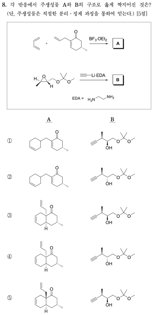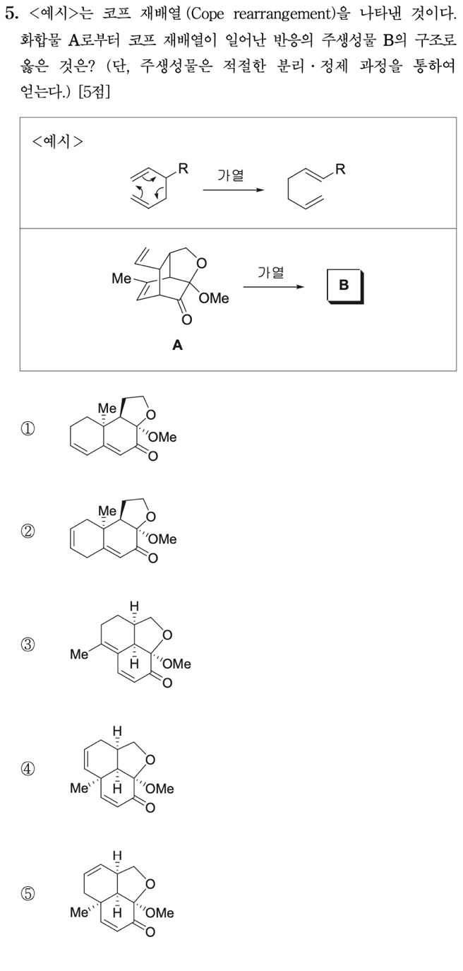 Cope Rearrangement는 고리협동반응으로 PEET출제 범위를 벗어나는 부분이나 위 문제는 주어진 자료를 이용해서 해석하는 문항으로 <예시>의 입체구조를 이용하면 어렵지 않게 답을 찾을 수 있다.