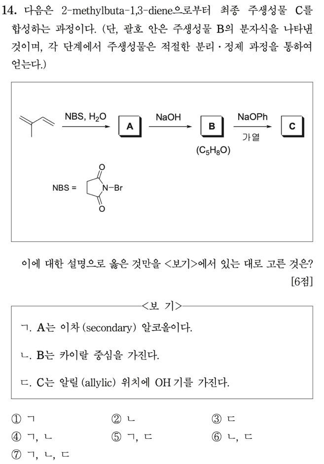ㄱ. 위에 제시된 반응처럼 A는 3차 Allylic 알코올이다. Cis, Trans 1차 Allylic 알코올일 가능성도 있으나 2차 알코올은 결코 아니다.