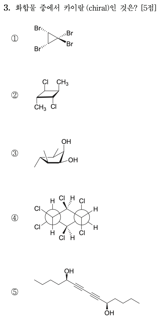 3) Chiral 탄소가 4개 존재하나 대칭면이 존재하는 Meso 화합물이므로 Chiral하지 않다.