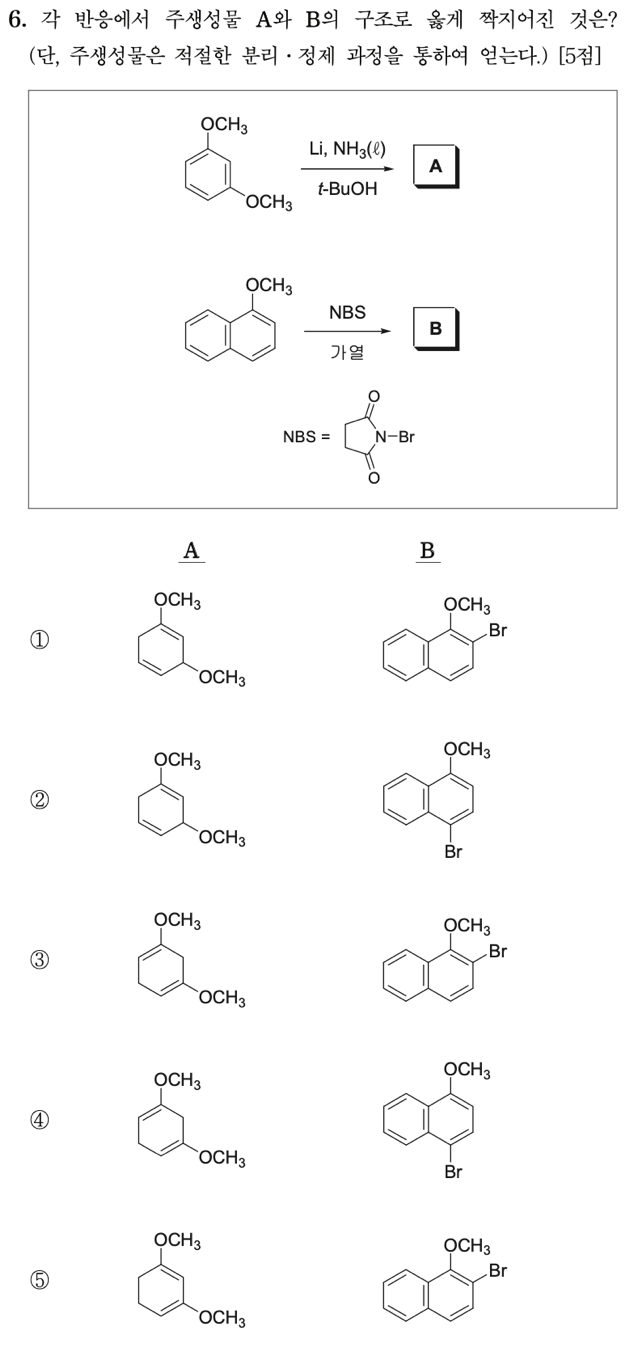 과년도 PEET기출문제를 보면, Alkyne의 Na/NH3을 이용한 Reduction에 대해 많이 출제된 것을 볼 수 있다. 이번 문제에서는 EDG가 포함된 Benzene의 Birch Reduction으로 반응 메커니즘에 따른 중간물질이 EDG작용기에 직접 전자가 있지 않은 <1>번 중간체가 <2>번 중간체보다 더 안정하다.