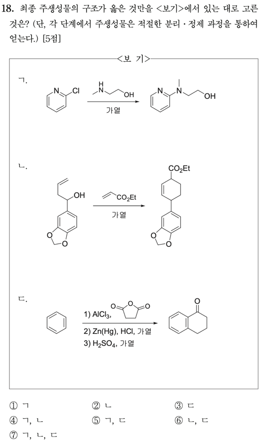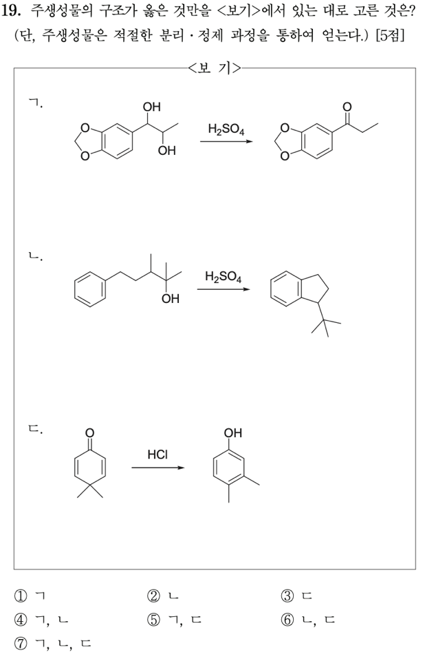 ㄱ. 산 조건에서 다음과 같이 반응하면 작용기에 따라 (1)번 반응과 (2)번 반응이 진행할 가능성이 있다. 이 반응은 SN1반응이므로, 탄소양이온 중간체가 형성되는 과정이 속도 결정단계이다. 따라서 (1)번 반응의 경우, 2차 Benzyl Carbocation이고 (2)번 반응의 경우, 2차 Carbocation으로 (1)번 반응이 주 반응이다. 또한, 반응물은 산 조건에서 Acetal 평형관계에 놓여있는데 반응이 진행되고 Acetal 평형반응도 진행하기 때문에 Catechol화합물이 생성될 가능성도 존재한다. 어느 관점에서든지 주 생성물은 제시된 생성물이 될 수 없다.