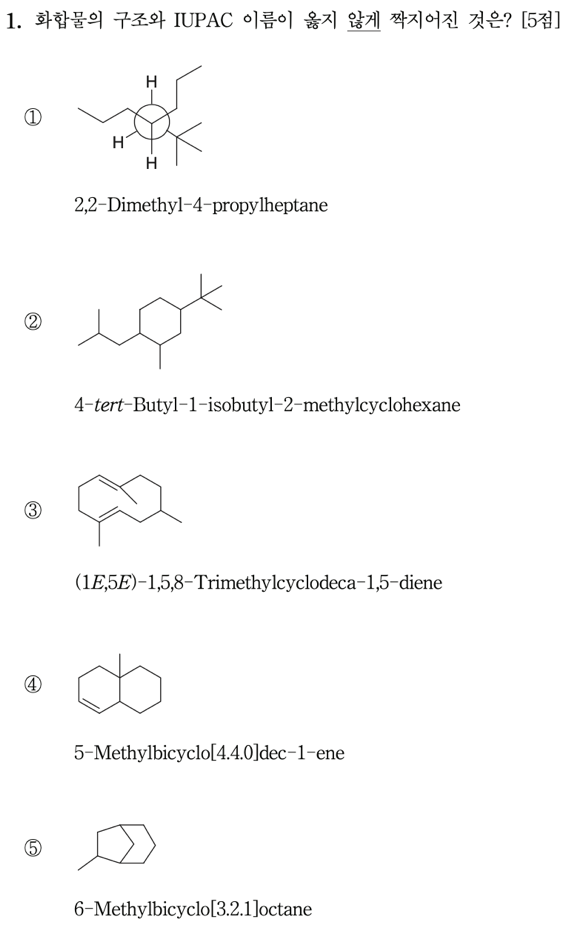 2) 탄소 수가 가장 많은 고리형태의 Cyclohexane이 모체이고 치환기의 우선순위는 1번 선지와 같이 알킬기로 모두 동일하므로 치환기의 번호가 작도록 하는 4-tert-Butyl-1-isobutyl-2-methylcyclohexane은 올바른 명명이다.