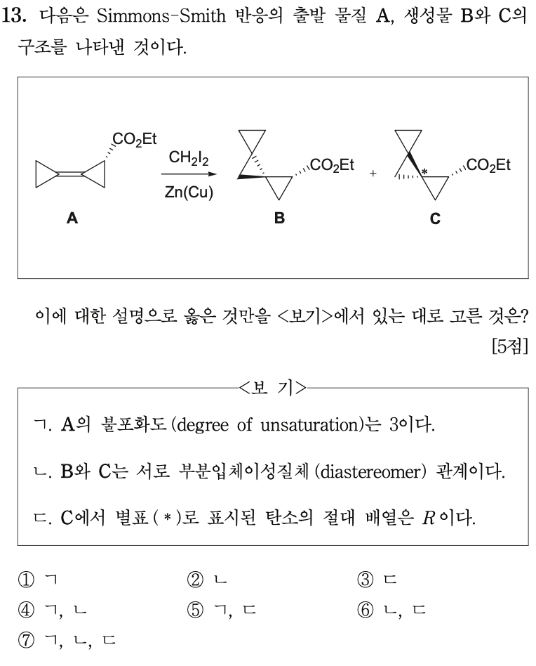ㄱ. 다음은 Carbene 반응으로, Alkene이 Carbene 중간체에 전자를 잘 줄수록 반응이 잘 일어난다. 따라서 EDG인 Methyl기가 달린 Alkene에 Cyclopropane이 주로 생성된다.