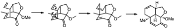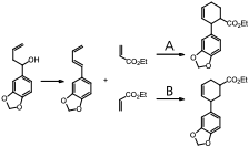 A반응은 루이스 산 촉매인 BF존재 하에서 Diels-Alder 반응이다. 루이스 산과 같은 촉매를 이용하면 0도 이하에서도 Diels-Alder반응을 일어나게 할 수 있는데 이는 endo-product가 생기는 조건과 같아 Cis-Decaline 유도체가 형성됨을 알 수 있다.