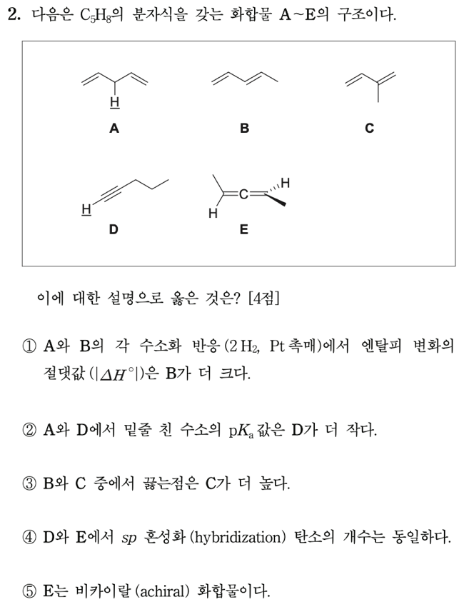 4) D는 sp혼성화 탄소는 2개 존재하고 E는 sp혼성화 탄소가 1개 존재하므로 동일하지 않다.