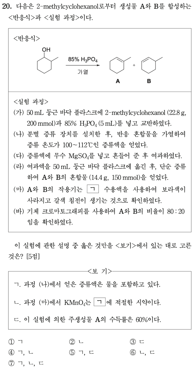ㄷ. 제시된 한계 반응물은 2-methylcyclohexanol이기 때문에 초기 반응물(200mmol)중 150mmol의 혼합물의 수득률(75%)을 얻었고, 그 중 A만의 비율이 80%이기 때문에 주 생성물(A)의 수득률은 다음과 같이 60%임을 알 수 있다. (yield : 0.75*0.8=60%)