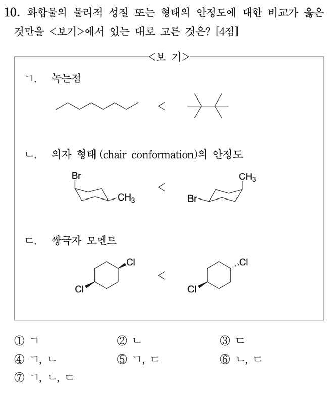 ㄷ. 왼쪽 화합물은 cis-1,4-Dichlorocyclohexane으로 쌍극자 모멘트의 합이 0보다 크지만, 오른쪽 화합물은 trans-1,4-Dichlorocyclohexane으로 쌍극자 모멘트의 합이 0이다. 따라서 왼쪽 화합물이 더 크다.