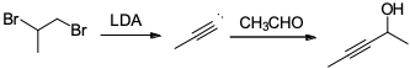 ㄷ. LDA는 non-Nucleophilic Base로 제거반응만 일어나는 염기시약이다. 따라서 Propagylic anion이 생성되고 Aldehyde와 친핵성 반응이 일어나기 때문에 Pentan-2-ol-3-nyl이 생성된다.