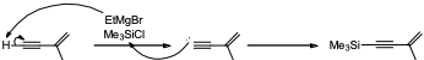 ㄴ. EtMgBr은 Grignard 시약으로 주로 Carbon-Carbon bond 형성반응에 주로 쓰이지만, 산성수소가 있는 조건에서는 산-염기 반응으로 쉽게 소모된다. Vinyl-H의 pKa는 약 45, Allylic-H의 pKa는 43, Alkynyl-H의 pKa는 25로 가장 강한 산과 염기가 반응하면 아래와 같이 Alkynyl anion이 생성되는 반응이 주로 일어나기 때문에 제시된 반응은 주 생성물을 적어놓지 않았다.