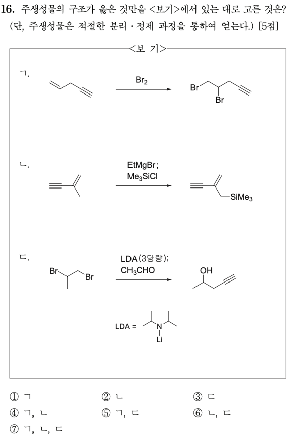 ㄱ. 첨가반응 시 Alkene과 Alkyne의 반응성을 비교하는 문제이다. Br2에 비해, Alkyne보다 Alkene이 전자를 더 잘 주는 성질을 갖기 때문에 제시된 주 생성물은 올바른 주 생성물이다.