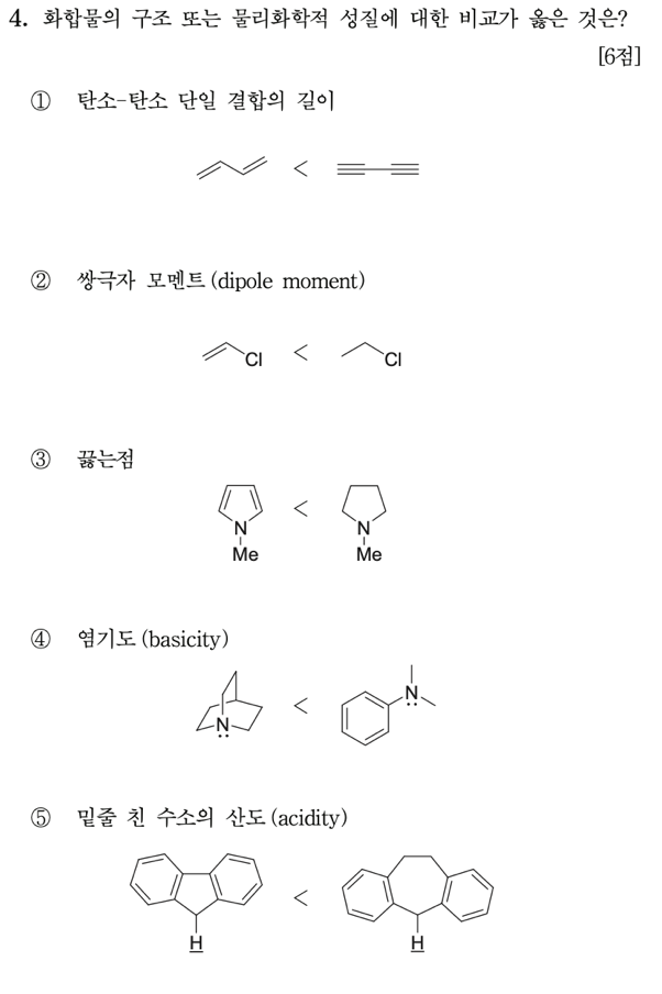 4) 염기성도가 크기 위해서는 질소의 비공유전자쌍이 편재화(localizing)되어 있어야 한다. 오른쪽 화합물인 N,N-dimethylaniline은 질소의 비공유전자쌍이 벤젠고리로 비편재화(delocalized)되어있으므로 비공유전자쌍의 염기성 역할이 줄어들게 된다 따라서 염기도는 왼쪽 화합물이 더 크다.