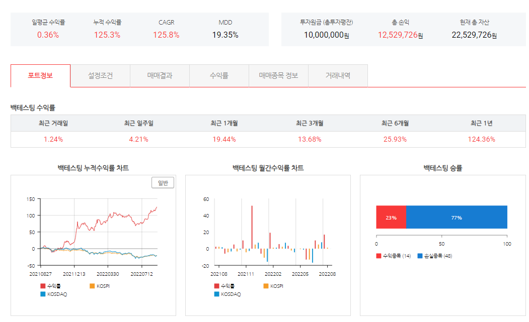 아래는 필자가 실전 매매에 현재 투입되고 있는 로직 하나를 가져온 것이다. 최근 1년은(2021.8~2022.7) 코로나 이후의 인플레이션, 우크라이나 전쟁, 원자재값 상승 등의 여러 경제적 악재가 겹쳤기 때문에 세계 증시가 하락했다. 그럼에도 불구하고 125%의 높은 CGR과 20% 미만의 낮은 MDD를 나타내었다. 더욱 돋보이는 것은 매매승률이 23%밖에 되지 않는 것이다.