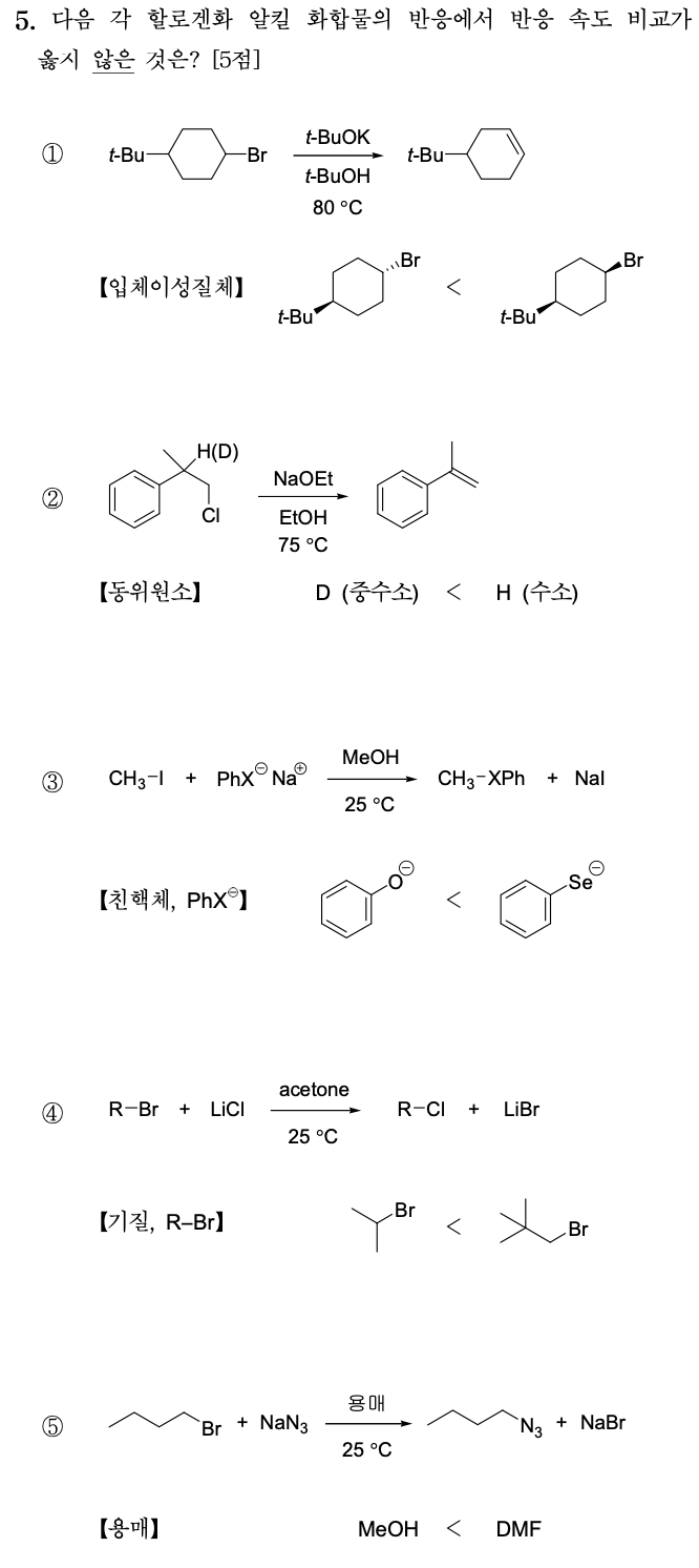 4) SN2반응에서 tert-Butyl기의 입체장애가 크기 때문에 왼쪽 화합물의 반응속도가 빠르다. (X)