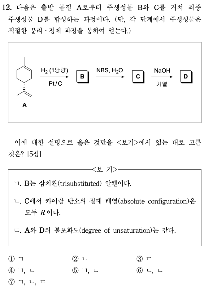 ㄷ. all-Trans steroid 환 구조에서 입체장애가 적고 Equatorial에 OH가 존재하는 것이 안정한 화합물이므로 옳은 반응이다. (O)