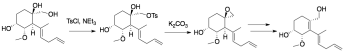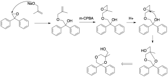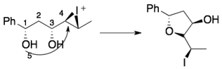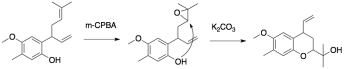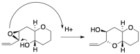 B : 다음과 같이 산 조건하에서 SN1 유사 에폭사이드 고리열림반응이 일어난다. 6각고리를 만드는 반응이 알릴기의 하이퍼컨쥬게이션을 경유하므로 전이상태가 안정하다.