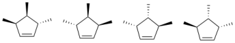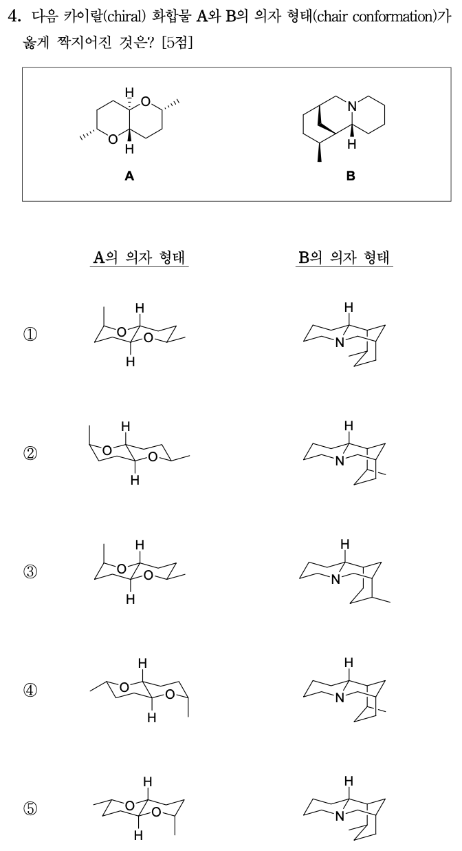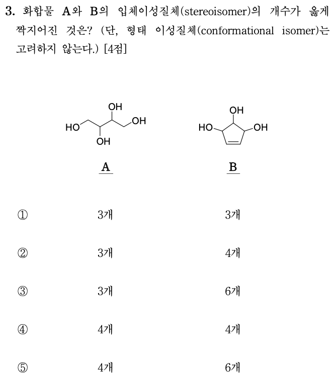 B : Chiral center가 세 개이고 Meso compound가 두 개, 아래의 4가지 가능성 중 첫 번째/네 번째 – 두 번째/세 번째는 같은 화합물이므로 2^(3) – 2 - 2 =4개이다.