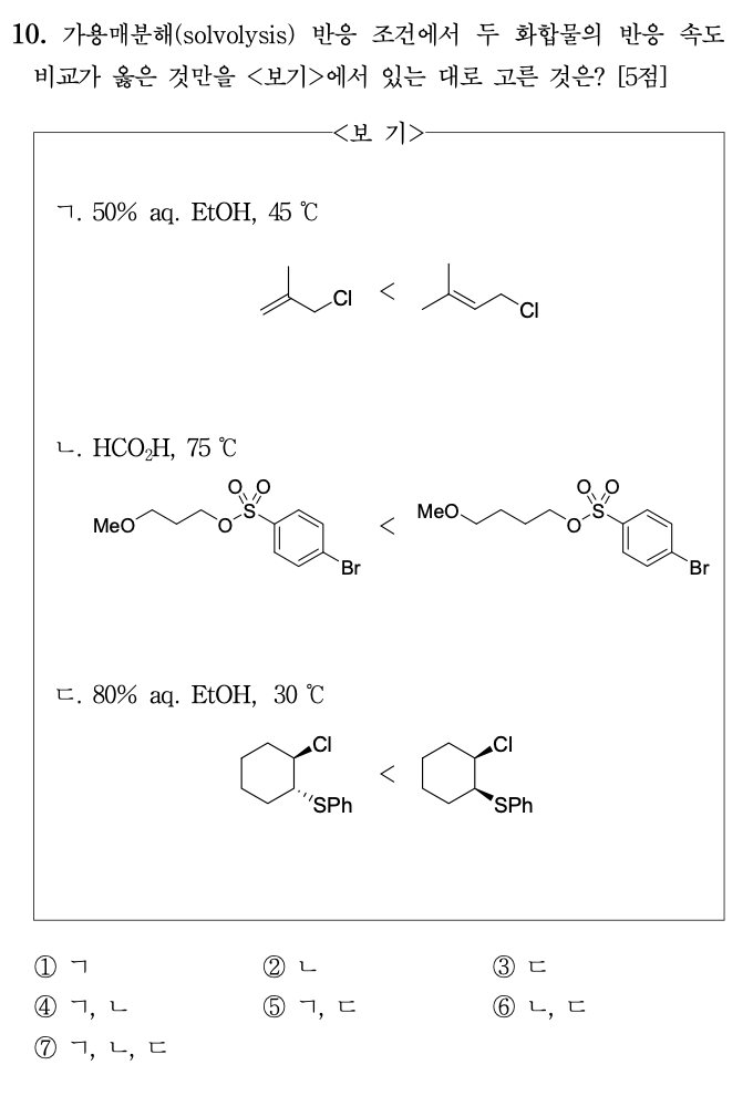 ㄱ. 왼쪽 화합물에 비해 오른쪽 화합물이 공명으로 인한 탄소양이온이 안정하기 때문에(1차 Allyl < 3차 Allyl) 옳은 비교이다. (O)