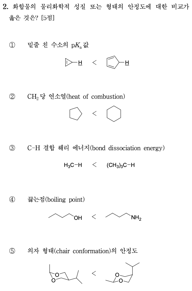 2) Cyclopentane은 Cyclohexane에 비해 약간의 Ring strain이 있으므로 CH2당 불안정도가 더 크기 때문에 CH2당 연소열도 크다. (X)