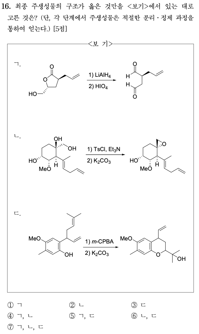 ㄱ. LiAlH4는 Lactone ring을 diol로 바꾸기 때문에 틀린 선지이다. 올바른 화합물은 아래와 같다. (X)