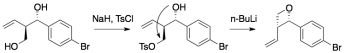 A : 다음과 같은 반응이 일어나며, 두 OH의 작용기의 pKa차가 크지 않기 때문에 둘 중 더 입체장애가 적은 쪽이 TsCl을 공격한다.