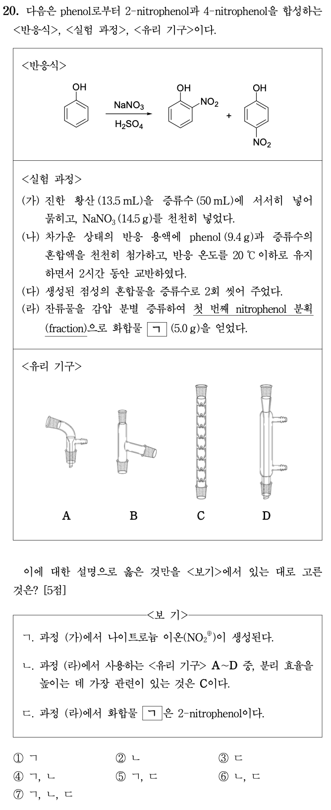 ㄴ. 생성물 중 주 생성물을 끓는점 차이로 판단할 수 있는 실험기구는 C이다. D는 응축기로, 반응온도가 용매의 끓는점보다 높아 용매를 유지할 때 사용한다. (O)