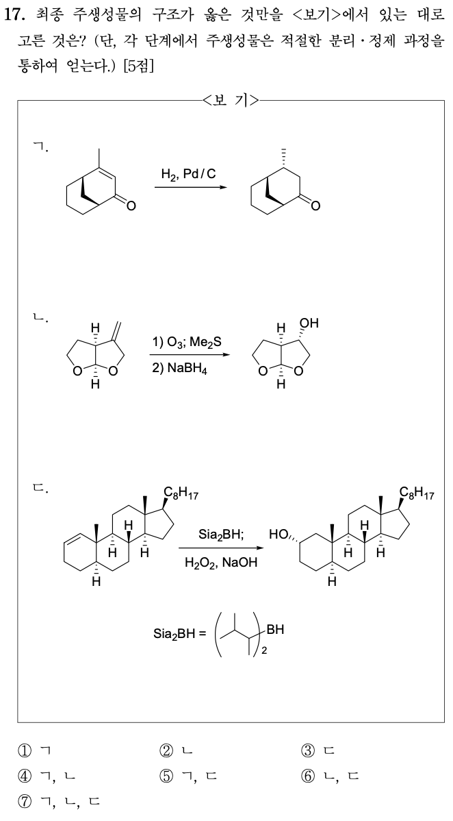 ㄷ. all-Trans steroid 환 구조에서 입체장애가 적고 Equatorial에 OH가 존재하는 것이 안정한 화합물이므로 옳은 반응이다. (O)