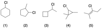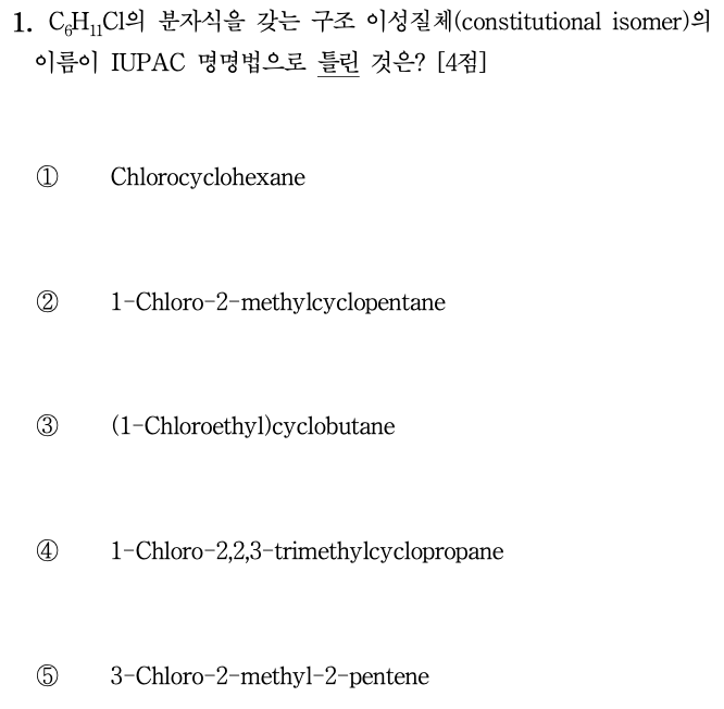 위와 같은 화합물로 모두 C6H11Cl의 구조이성질체이지만, (4) 화합물의 경우 Chloro-와 Methyl- 가 포함된 모체의 우선순위가 없기 때문에 2-Chloro-1,1,3-trimethylcyclopropane이라고 해야 옳다.