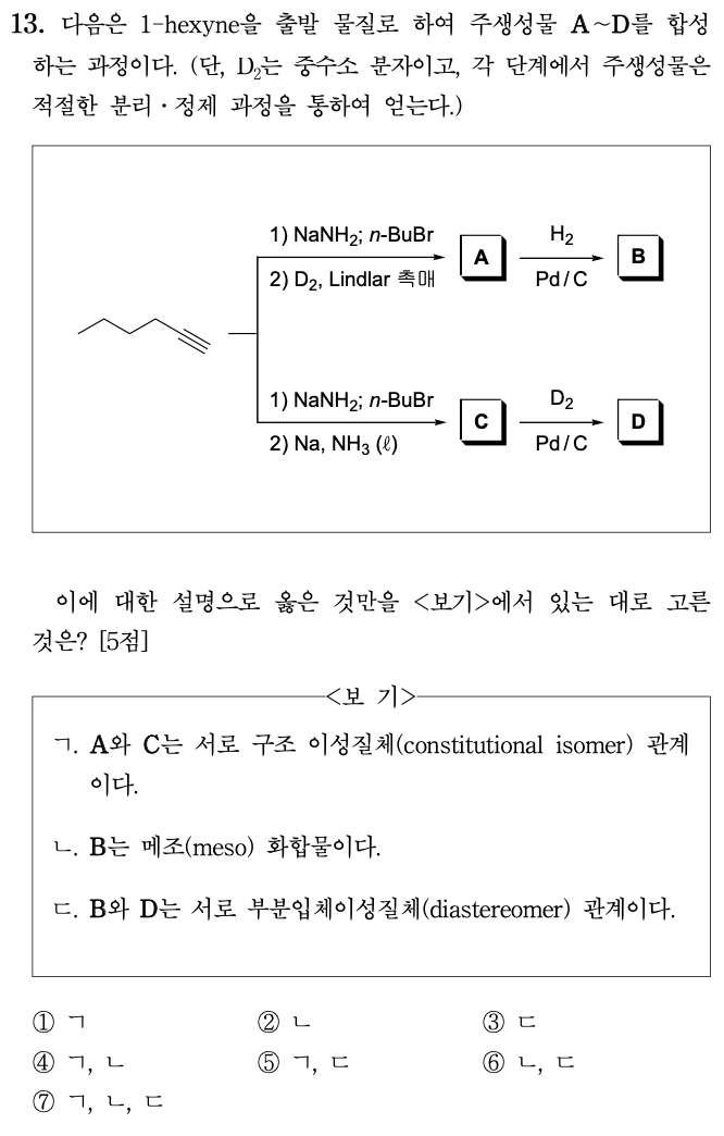 ㄱ. H2/Pd가 위에서 공격하는 것이 더 입체장애가 작기 때문에 올바른 생성물이다. (O)