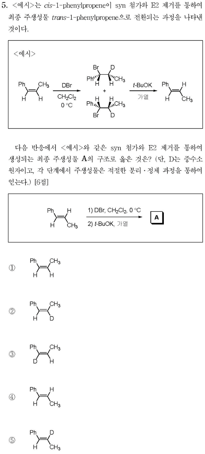 동일한 전이상태에서 Trans alkene을 생성하는 Anti-periplanar 위치에서 E2 제거반응을 통해 5번 화합물을 얻을 수 있다.