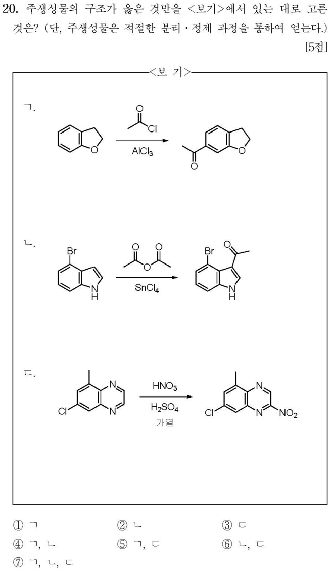 ㄱ. Friedel-Crafts acylation은 전자가 가장 풍부한 EDG 기준 ortho, para 위치에 치환반응이 일어나므로 틀리다. 아래 화합물이 옳은 화합물이다. (X)