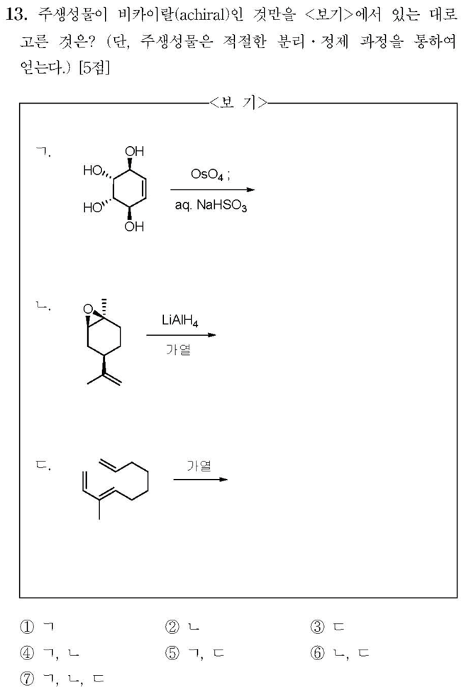 ㄱ. OsO4는 Syn-diol-addition을 통해 화합물을 형성하고 생성물은 Meso로 광학 활성을 띄지 않는다. (O)