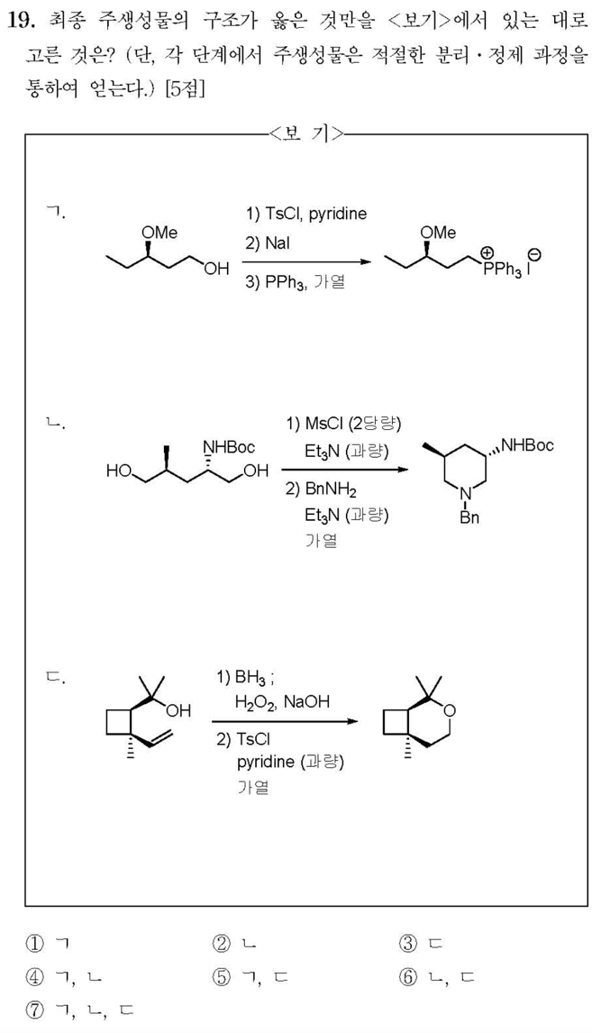 ㄷ. Anti-markovnikov's rule에 의해 말단 OH가 형성되고 -OTs로 변화한 다음 분자 내 SN2 reaction을 통해 옳은 화합물이 생성된다. 어느 분자가- OTs로 변화되더라도 결과는 같다. (O)