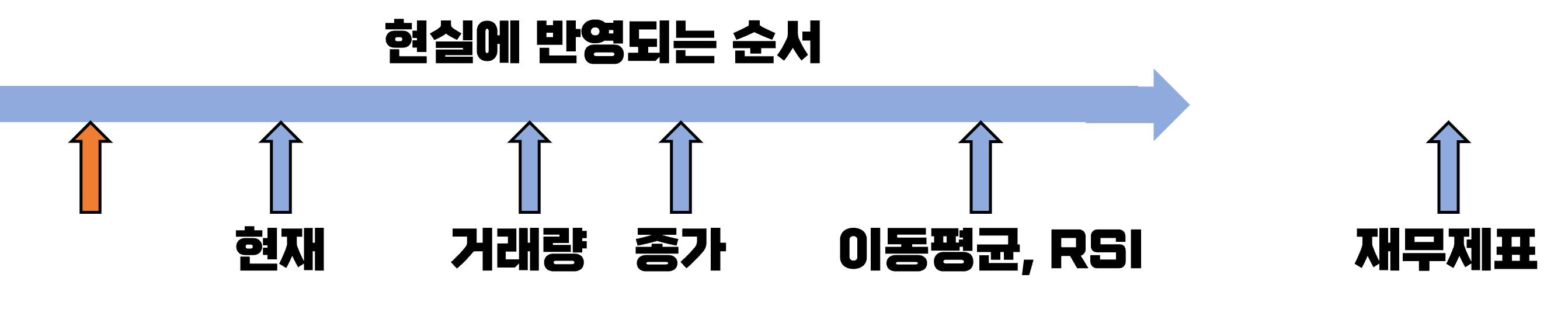 논리적으로 주가가 변동되는 원인에 대해 생각해보자. 먼저 주식을 사고 파는 행위에 의해 거래량이 생성된다. 그 다음 하루의 거래가 모두 마감되면 그날의 종가가 생성되고 이 종가들이 모여 이동평균선들을 이룬다. 14일선을 기본적으로 많이 쓰는 RSI 지표같은경우, 14일의 가격정보가 모두 확정된 후 생성된다. 이를 정리하면 아래 그림과 같다.