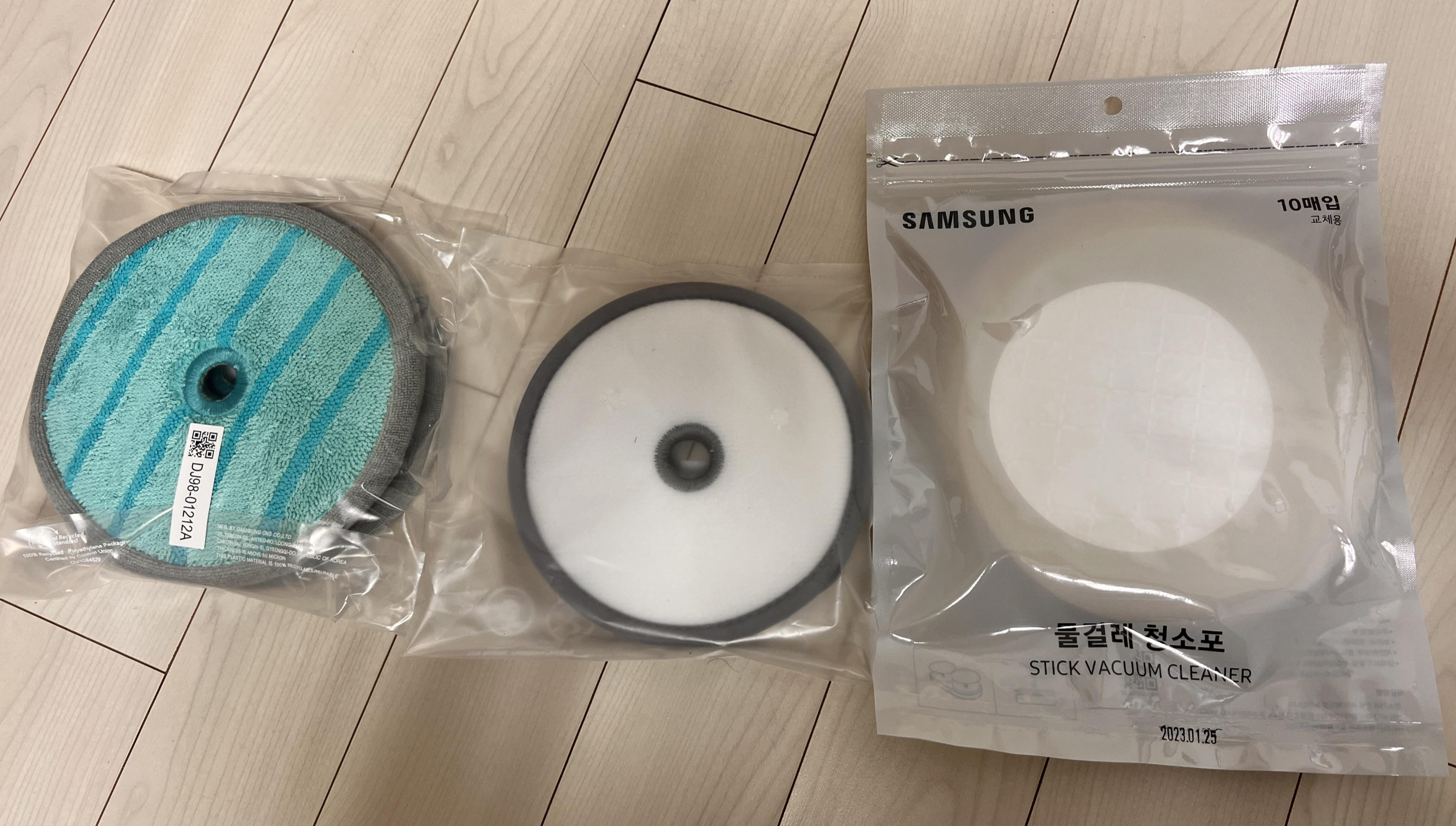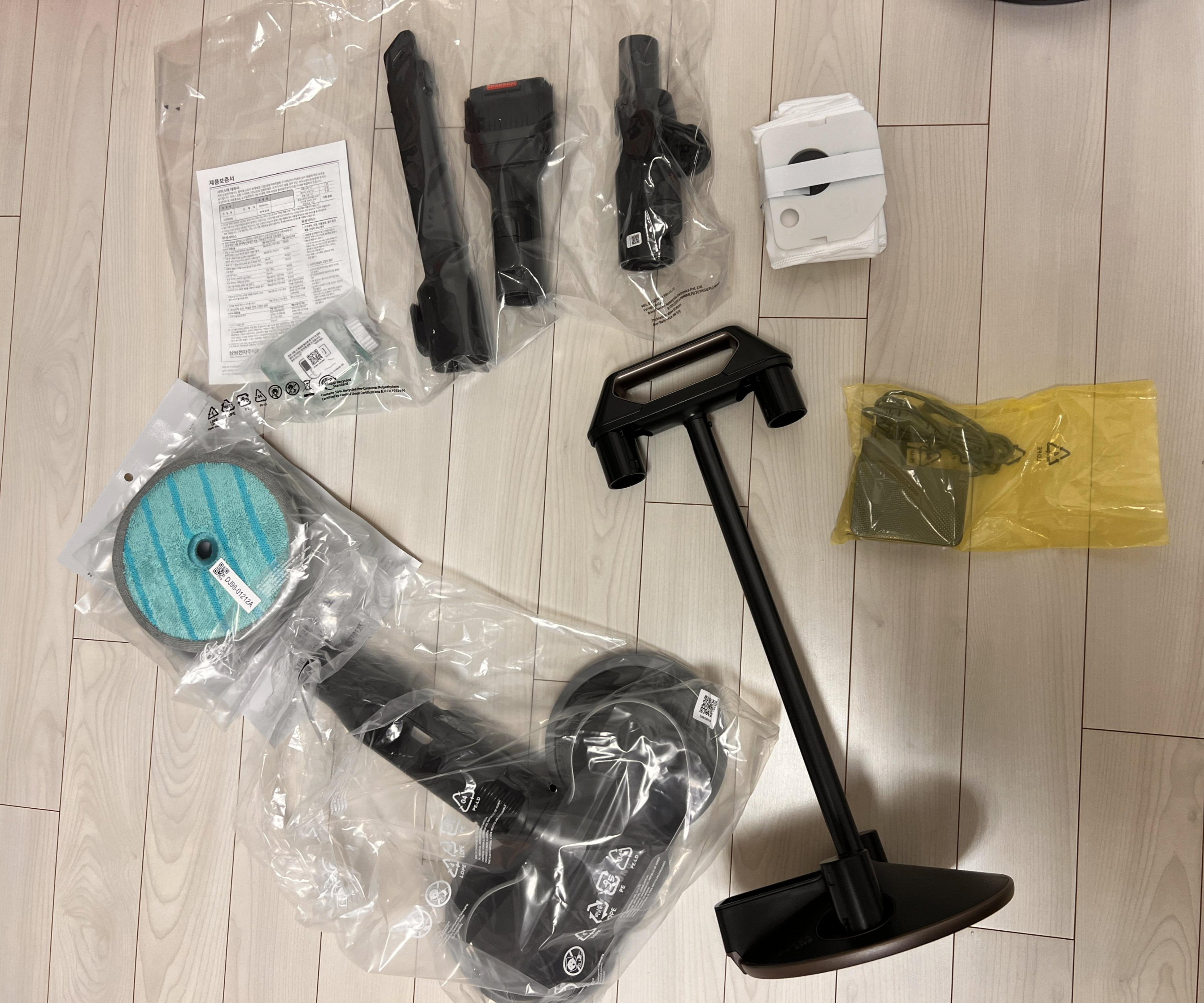 물걸레 옵션이 포함된 모델을 샀기 때문에, 물분사/물걸레 브러시가 같이 배송되었고, 다회용 물걸레와 일회용 물걸레포 10개, 부착패드가 함께 배송되었다.