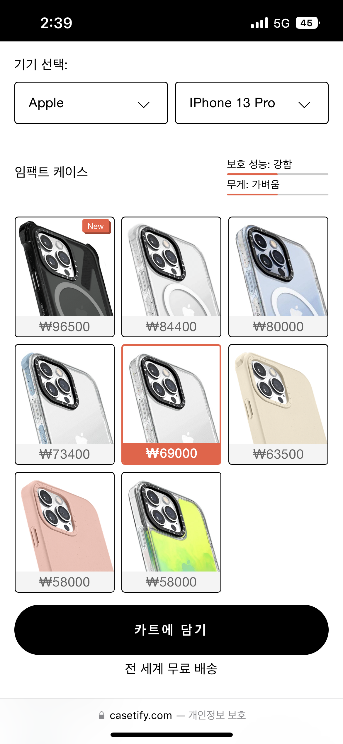 범퍼 케이스의 경우, 케이스 별로 보호 성능과 무게를 간단하게 오른쪽 위에 표기해준다.