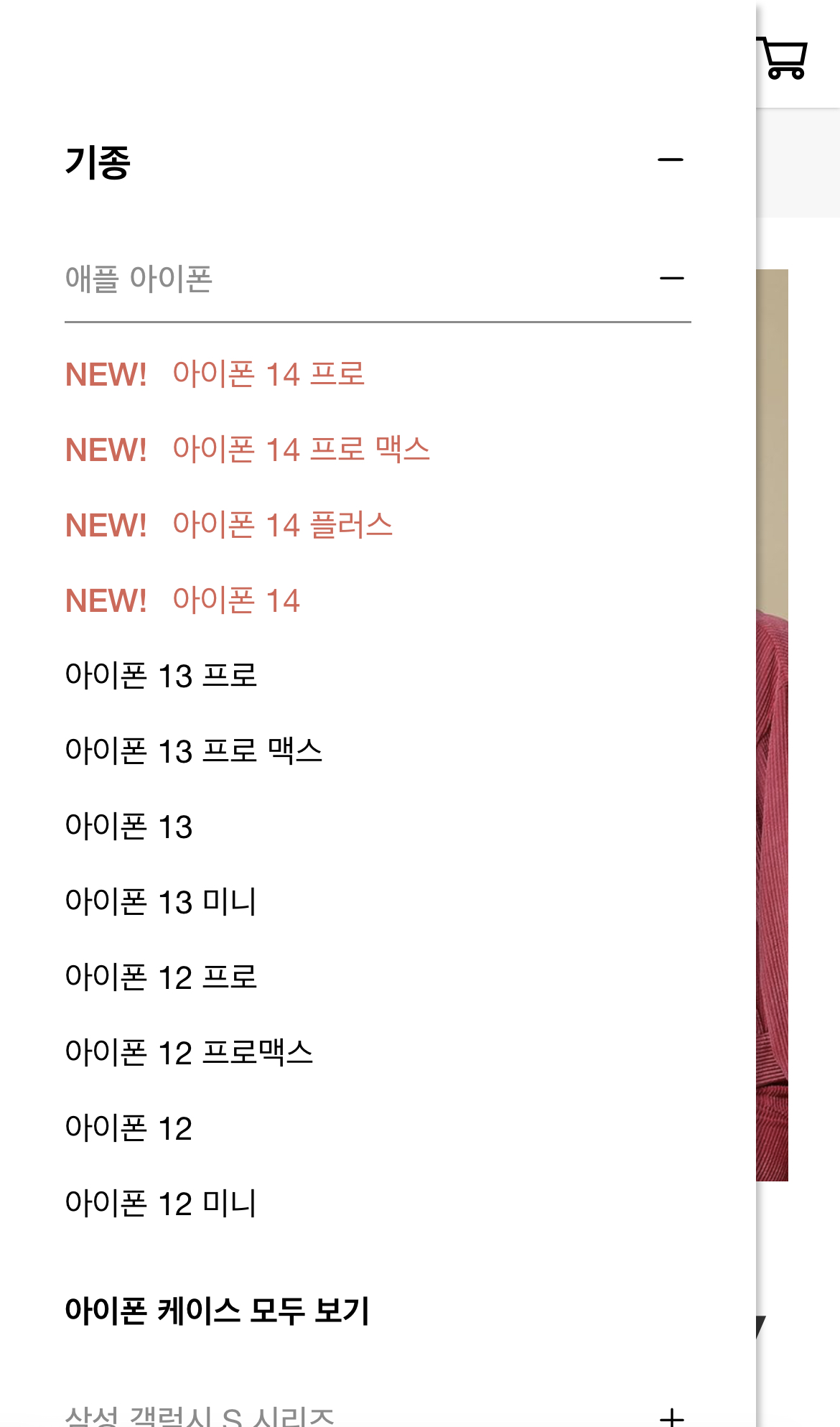내가 원하는 디자인을 찾아 클릭하면, 그 디자인을 바탕으로 범퍼 케이스의 종류와 색상을 고를 수 있다.